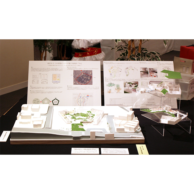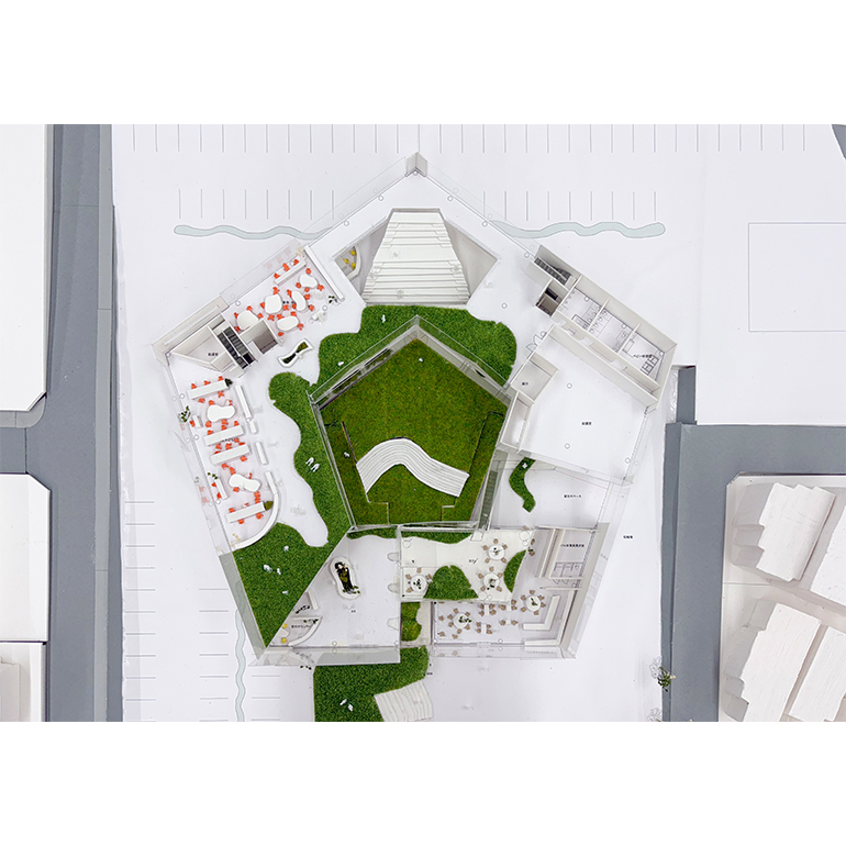 緑区を1つの家族にすること、役所を拠点に地域の「わ」を創ることをテーマとしました。実際の地域住民のニーズに応えた新たな緑区役所に、他機能を含める5角形の「わ」の施設を提案することで緑区に年齢問わず自然と人が集まる地域拠点をつくることを目的としています。特に敷地の高低差を利用し、緑区の代表的な屋外遊具施設である大高緑地の特徴を連想させるような待合空間や外構空間に力を入れることで緑区らしい公共施設となるような設計としました。
