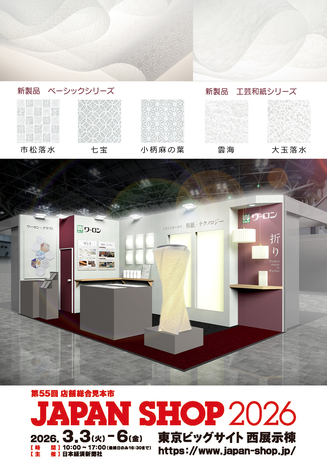 『和紙×テクノロジー - 上質な空間の演出 -』をテーマに、上記の新製品の大判サイズでの展示やサンプル配布、全国の和紙産地とのコラボ事業(WLS:Warlon Laminate Solution、和紙加工サービス)や、ワーロン製品の加工事例のご紹介などを行います。お近くにお越しの際は、お立ち寄りいただけますと幸いです。