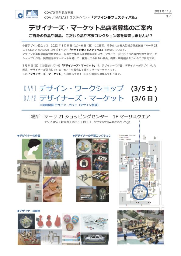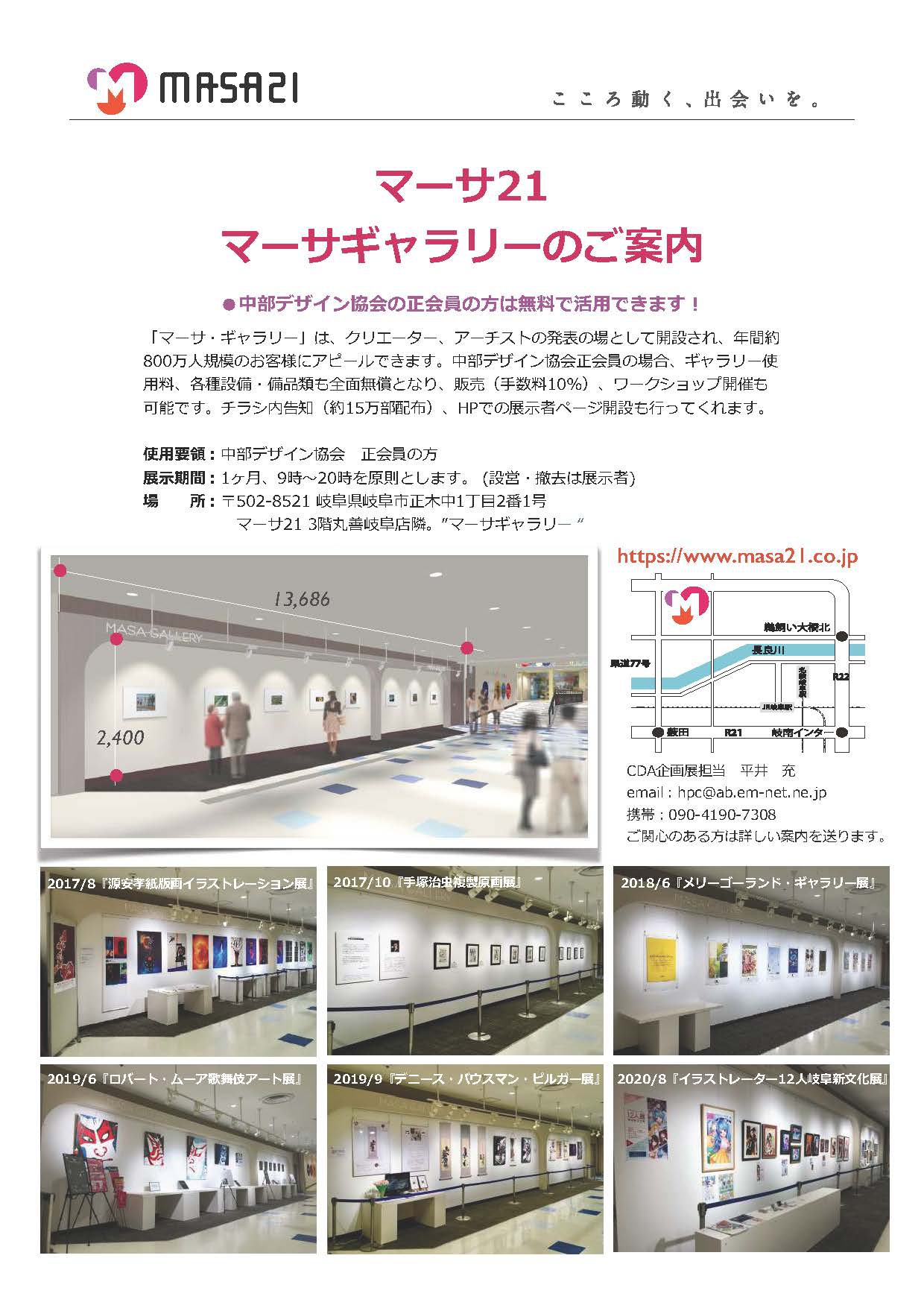 岐阜市在のマーサ21ショッピングセンターに、2015年のリニューアルの際にクリエーターが使用できる「マーサギャラリー」が開設されました。今回、中部デザイン協会正会員について、ギャラリー使用料、設備・備品代はすべて無料でご利用頂けます。その他、約15万部のチラシ内での告知、展覧会のホームページ開設、施設内告知なども無償で行って頂けます。販売、および、同時に別の場所でワークショップなどの開催も可能です。(販売については申告制で売上の10%のみ手数料がかかります)