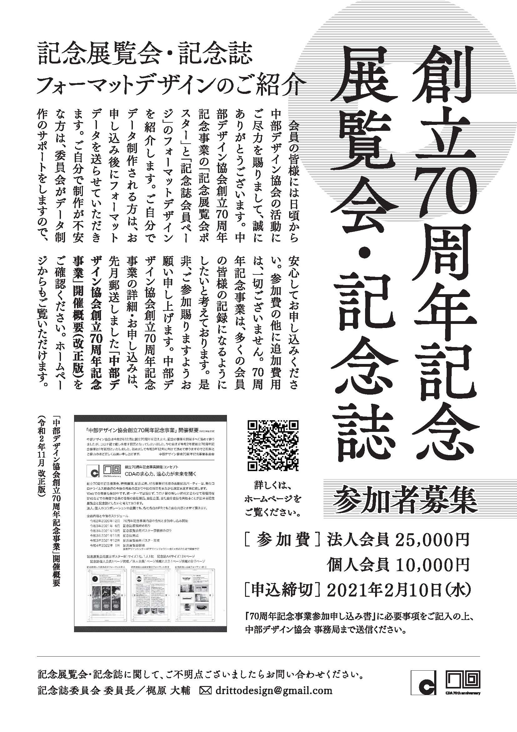 2021年11月完成予定でおります「70周年記念誌」のデザインフォーマットと「記念展覧会」のフォーマットデザインのご紹介です。ご自分でデータ制作される方には、データを送らせていただきます。ご自分での制作が不安な方は委員会がデータ制作致しますので、安心してご参加ください。※記念展覧会用展示ポスターB1サイズ 1社1枚(法人)、1人1枚(個人)・法人、個人のコラボレーション企画は立体展示も可。スペースは900角以内(但し、国際デザインセンター4Fギャラリーの展示のみ)