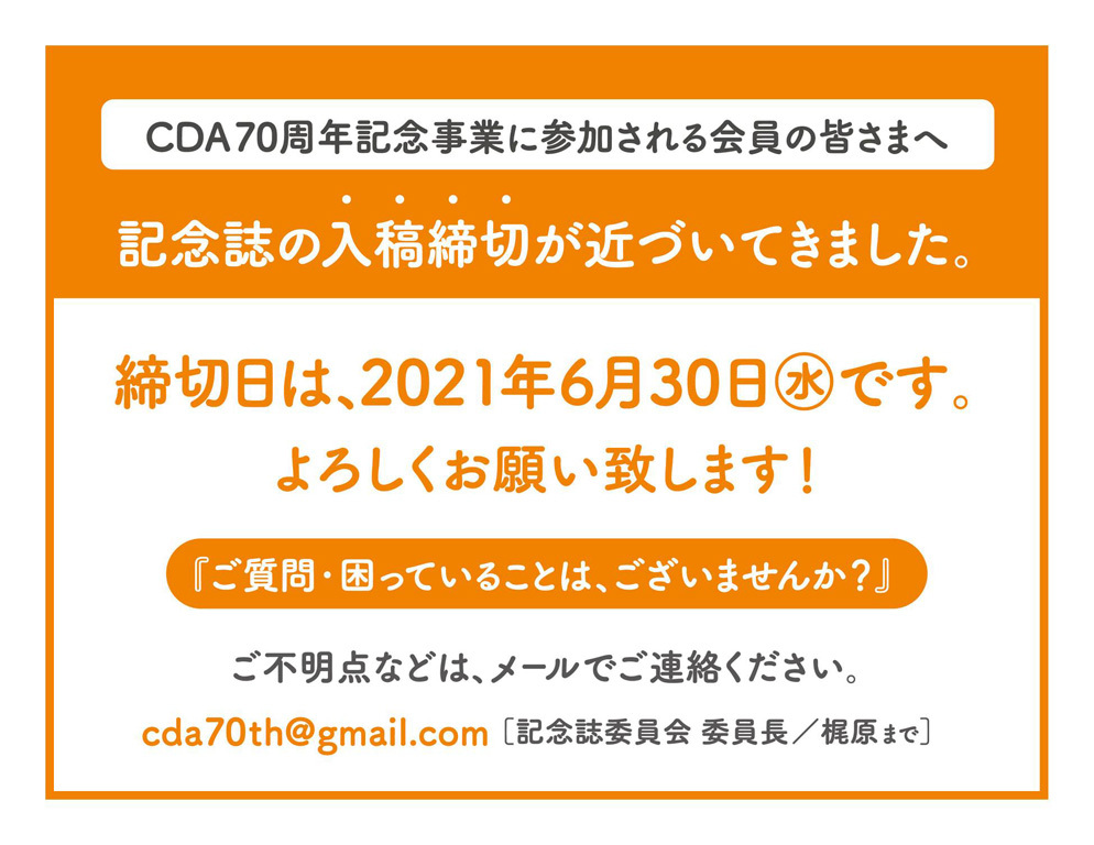 このたびは、70周年記念事業『記念展覧会・記念誌』にお申込みいただき誠にありがとうございます。3月にご案内させていただきました 記念誌会員ページのデータ入稿及び、デザインサポートの締め切りが近づいてきました。まだ入稿がお済みでない方は、ご対応よろしくお願い致します。