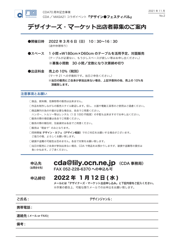 CDA の WEB ギャラリー をこの機会にリニューアルする為、今回ナゴヤアーティストエイドで制作し た映像に会員の皆様の作品を追加して、中部デザイン協会の Web ギャラリーを制作した いと思っております。第 1 回の締め切りは 2021 年 1 月 10 日を予定しております。