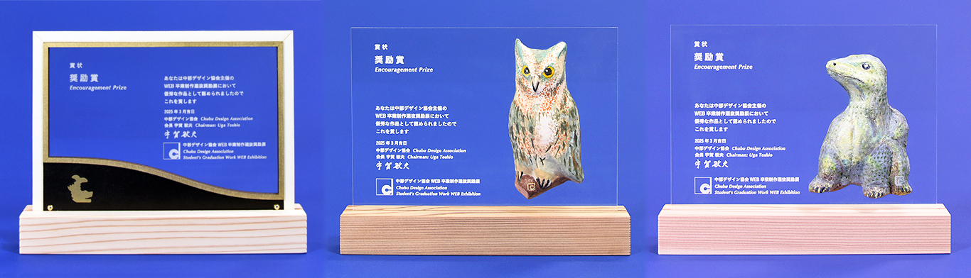 奨励楯は学生参加事業委員の手によって新作の3タイプを用意、中部地区ゆかりのシャチホコシルエットを刻むタイプ、陶器粘土によるアニマルフィギュアとして東山動植物園に新たに加わったコモドドラゴンと愛知県の鳥であるコノハズクの2タイプを制作しました。中部地区での学生生活を思い出しつつ、新たなフィールドで更なる飛躍が出来ますよう祈念いたします。アクリル版には表彰対象者の所属校とお名前をCDA宇賀敏夫会長のサインと共にレーザー加工によって刻印しました。 ご卒業おめでとうございます。